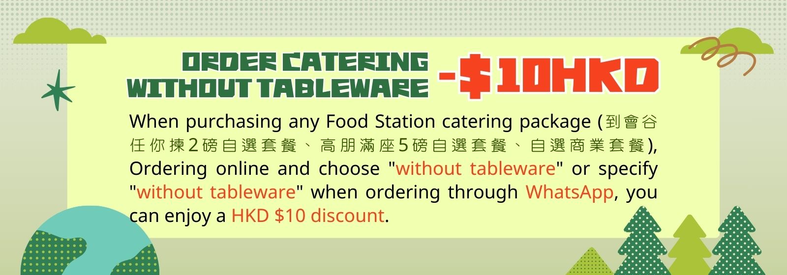 Discount coupons from the below offers are only applicable to the next food station catering set order.Rewards a HKD$60 Food Station Voucher.